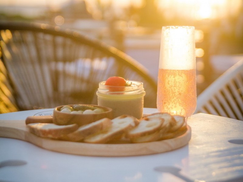 Beach & Bubbles offers a picturesque setting on Layan beach for sunset drinks and snacks, with a variety of seating options and a menu featuring wine, beer, cocktails, champagne, and snacks like cheese boards and oysters.