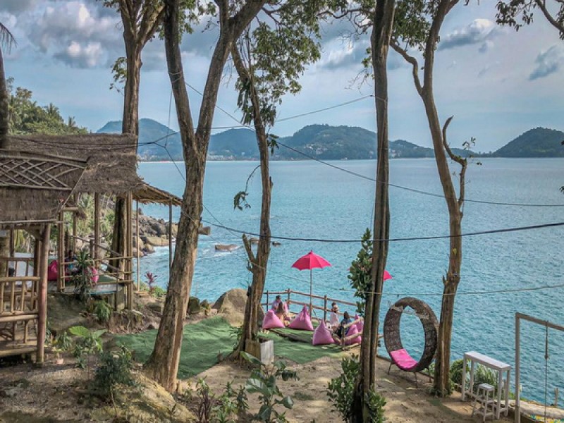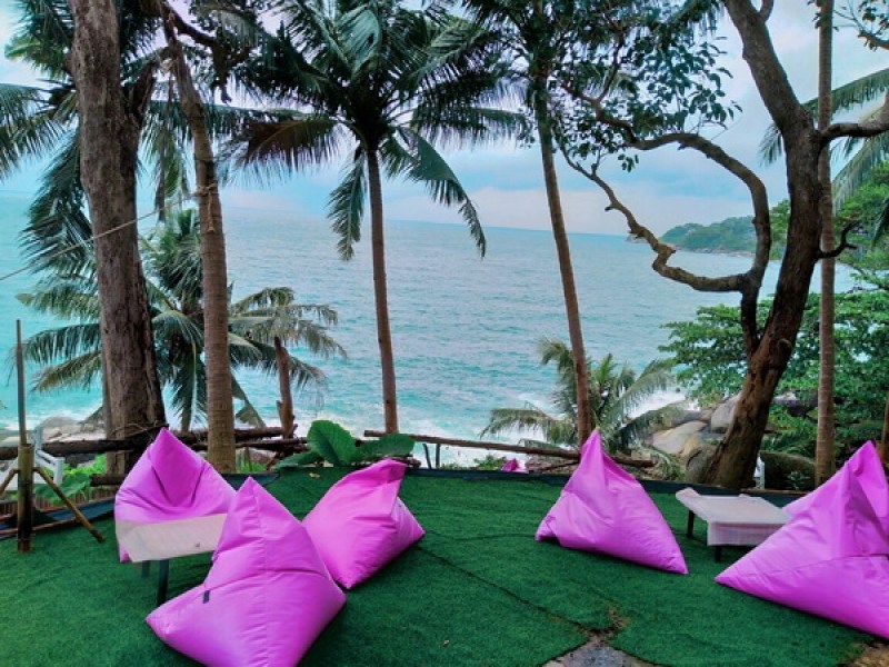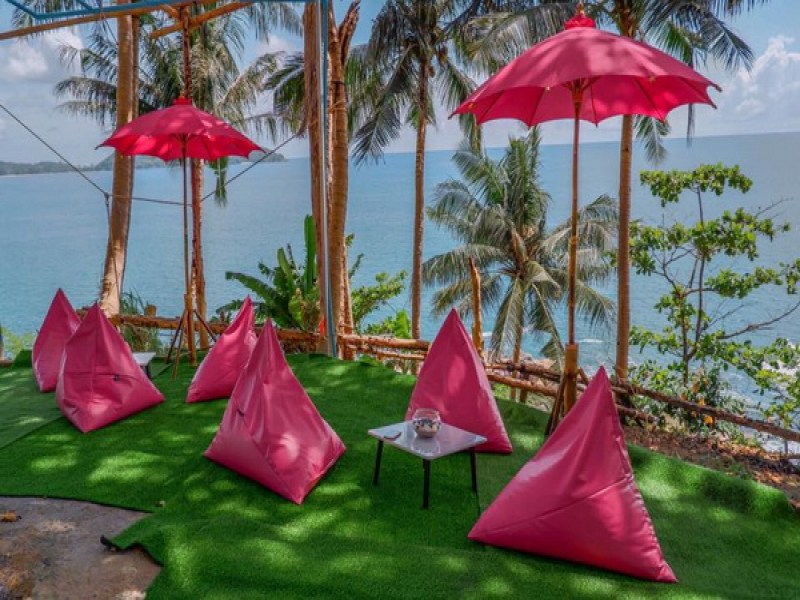 Cafe Phuket View Point offers a unique dining experience with a mix of low tables and bean bags overlooking the sea. They serve a variety of hot and cold drinks, cakes, and snack items in a rustic setting on Kamala Patong Rd.