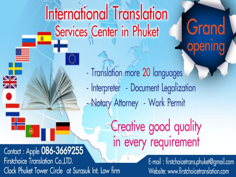First Choice Translation is an international translation centre for any kinds of document, letter, press and website. With more than 5 year experience, we can guarantee that our interpreters come with a lot of translation skills to provide customers with best translation quality. Apart from good quality, the service speed is the other thing which we care about to ensure our customer's satisfaction. Our translation services cover a variety of languages including English, Chinese, Japanese, Korean, Lao, Burmese, Vietnamese, Cambodian, Malay, Indonesian, Indian, Russian, German, French, Portuguese, Italian, Dutch and Spanish. We are located approximately 100 metres from Surin Traffic Circle which is locally known as clock tower roundabout, on Talingchan street.