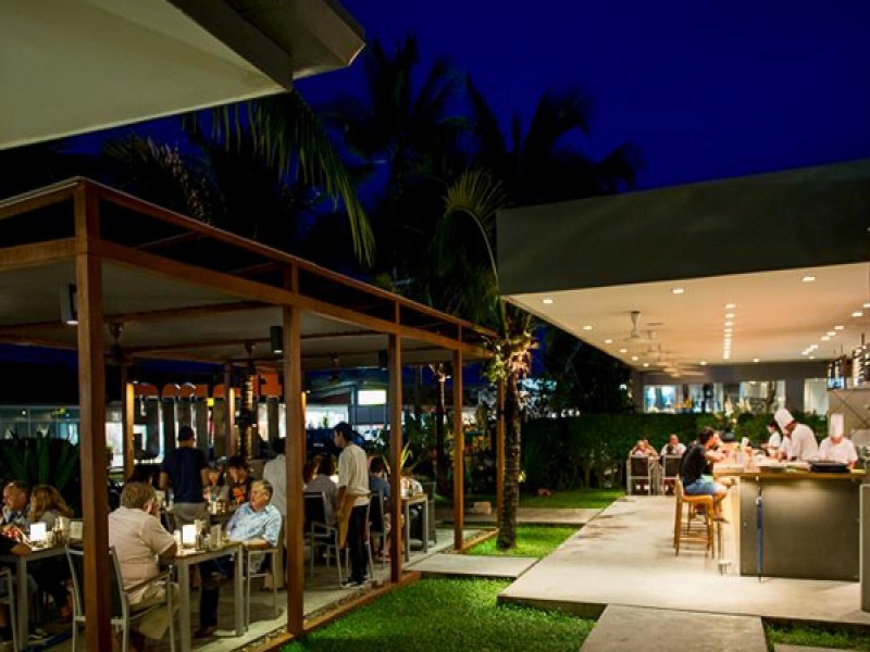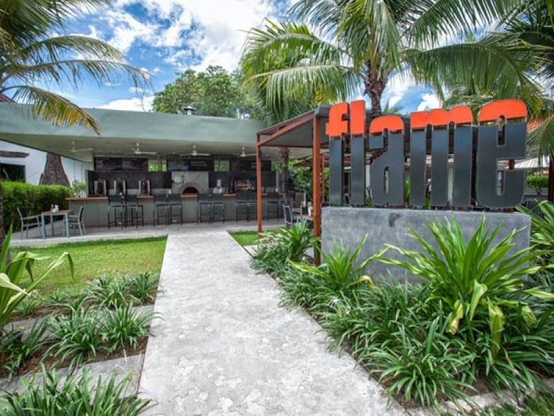 The Flame is a modern open kitchen restaurant in Cherngtalay offering wood fired pizzas, ribs, and spit roasted chickens with unique flavor options. They also have a branch at Sino@ByPass on Bangyai Road.