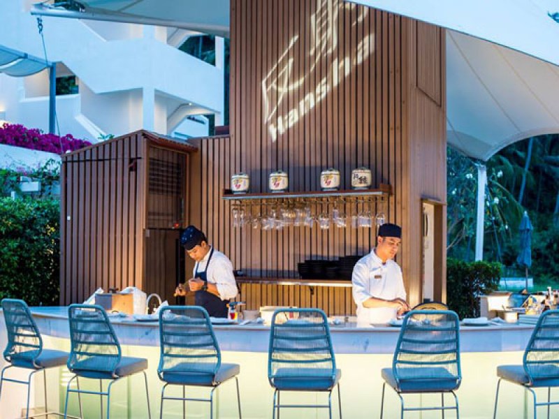 With sea view roof terrace overlooking Nai Harn Beach and stylish open kitchen, Hansha Sushi & Sashimi Bar serves a great selection of Japanese favourites including signature dishes like sashimi, nigari and sushi rolls. The drink menu features a variety of beers, imported sake and traditional liquor shochu. Guests can enjoy beautiful food displays and watching the master sushi chef prepare delicious meals at the live sushi station. This alfresco dining sushi and sashimi bar is located at the Reflections Rooftop Lounge of The Nai Harn Phuket. Open for dinner only from Friday to Tuesday.