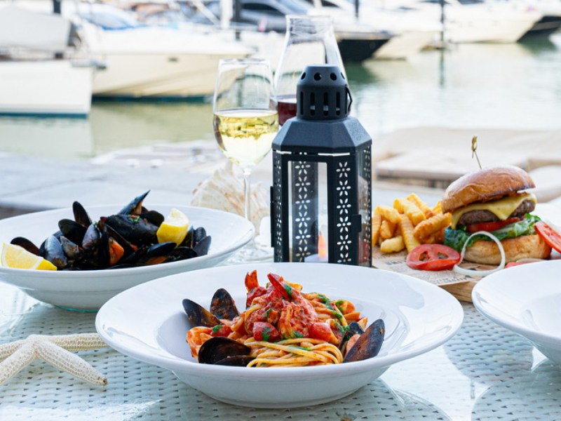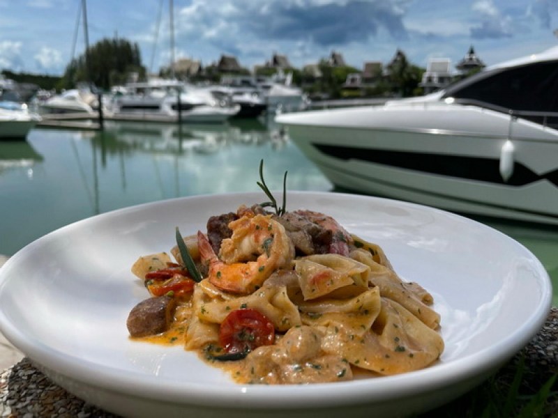 Isola Restaurant at Royal Phuket Marina offers authentic Italian cuisine made with fresh, locally sourced ingredients by a genuine Italian chef. Enjoy signature dishes like homemade pasta and thin pizzas while dining indoors or alfresco with views of luxury yachts.