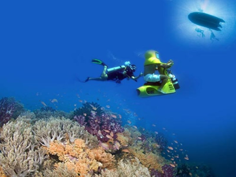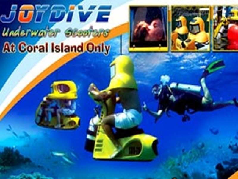 Welcome to JOYDIVE Underwater Scooters. General Information and Driving Instruction 1. The Underwater Scooter has two electric motors, one for forward movement, and the other for vertical movement to go up. The forward movement button is located on the right hand side of the Steering Arm ( as per pic. ) and the UP button located on the left hand side of the steering arm. 2. The depth of the scooter is controlled by safety buoy and set at 4 meters, which will stop you from bumping the coral or the sea bottom. It also allows our dive instructor to track your position as you drive the course. 3. The Scooter has two gauges, one for the depth And the other for the air. Pls, monitor the gauges while driving, note the air pressure must always be above 40 bar. If the pressure drops below 40 bar, please return to the platform. The air will continue to flow into the helmet, so just breath normally as you return. On Starting Your Dive 1. Enter the water via the boarding ladder on the side of the dive platform and slip into the scooter. NOTE, “always driver first” and then the passenger. You will be then lowered into the water. Our dive instructor will then help you drive the scooter out and descent (go down) to the 4 meter level. While descending keep equalizing your ear pressure – this is very important. Because the scooter has been pre-set at 4 meters, decompression is not a problem. So, sit back, drive and enjoy your underwater exploration. 2. As you start to drive our dive instructor will be by your side. When you feel comfortable the diver will leave you to drive the course alone. 3. The course is designated by an underwater buoy line, so simply follow the buoys and always keep the yellow buoys on your right shoulder. At the half way mark the buoys will change to white. Now keep the white buoys on your right shoulder, which will lead you back to the dive platform. You may stop along the course to view the coral and the tropical fish. But not for too long as we would like to avoid an underwater traffic jam. Finishing your Dive 1. When you arrive back at the start-finish area our dive instructor will be waiting. He will help you bring the scooter to the surface. 2. Slip out of the scooter and swim to the boarding ladder at the side of the platform. NOTE. At any stage while you are driving the course you feel you are not comfortable, take a deep breath and slip out of the scooter, swim to the surface and hold the safety buoy ( our crew will come to you).