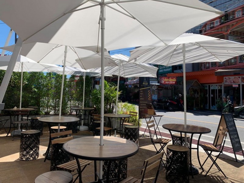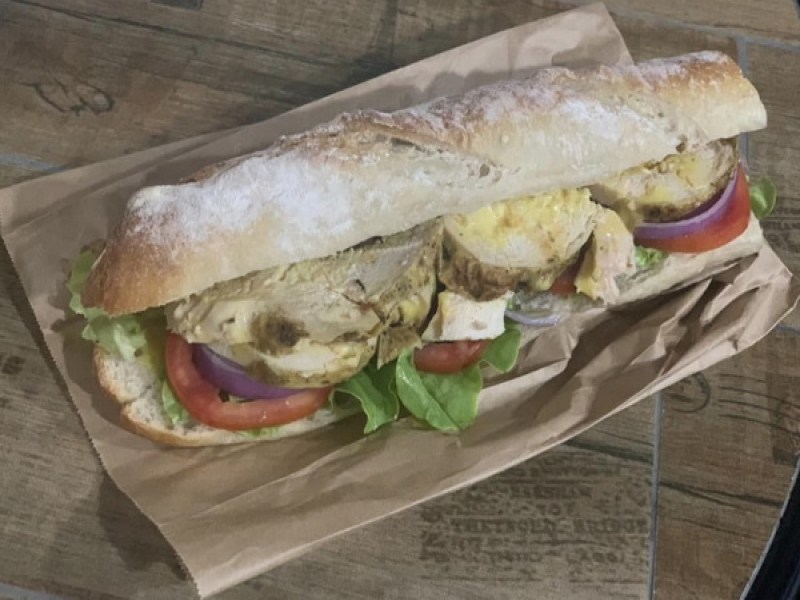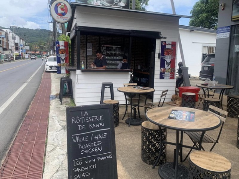 La Rôtisserie de Rawai is a small kiosk specializing in freshly roasted French-style chicken, offering whole and half chickens, chicken legs, sandwiches, and side dishes. They provide a home delivery service through GrabFood and Foodpanda, and have a small outdoor eating area for customers.