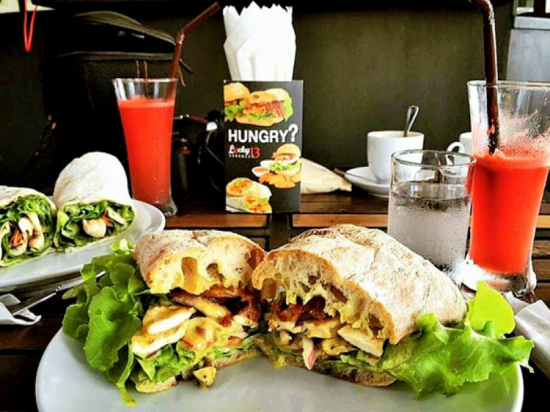 The Lucky 13 Sandwich Kamala is open for sandwiches, burgers, fries and wings, salads, wraps, hot and iced coffees and a range of milk and juice shakes including a detox juice. They even have small portion burgers and chicken wings for kids. The seating area is part open air but has a roof for shade and fans. This sandwich shop is sited in 6/23 Moo 3 Kamala, facing Kamala Beach, near Baan Natacha Hotel. The Lucky 13 Sandwich Kamala is open from 7am until midnight 7 days a week and it provides a local area delvery service.