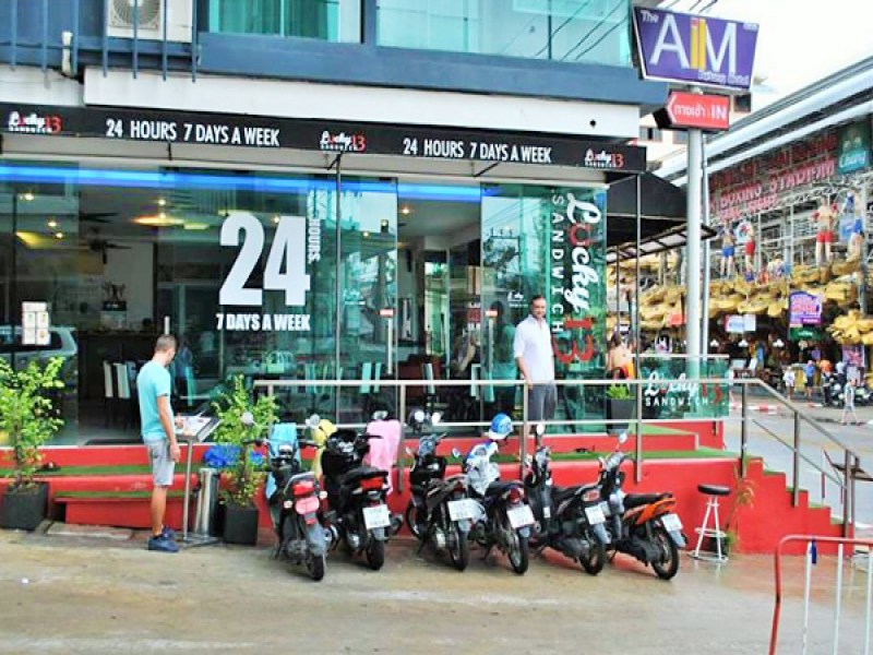 The Lucky 13 Sandwich Patong is loctaed on Phangmuang Sai Ko Road, nearby to the Bangla Boxing Stadium and Let's Relax Patong 3rd Street. It is open 24 hours, 7 days a week and serves a whole range of tasty sandwiches using different types of breads, burgers including vegetarian burgers, juice shakes, coffees and much more. The door entrance is reached by walking up a very short but very steep slope. The interior of Lucky 13 Sandwich Patong is fitted out with tables and comfy chairs and fans for coolness. they also provide a delivery service.