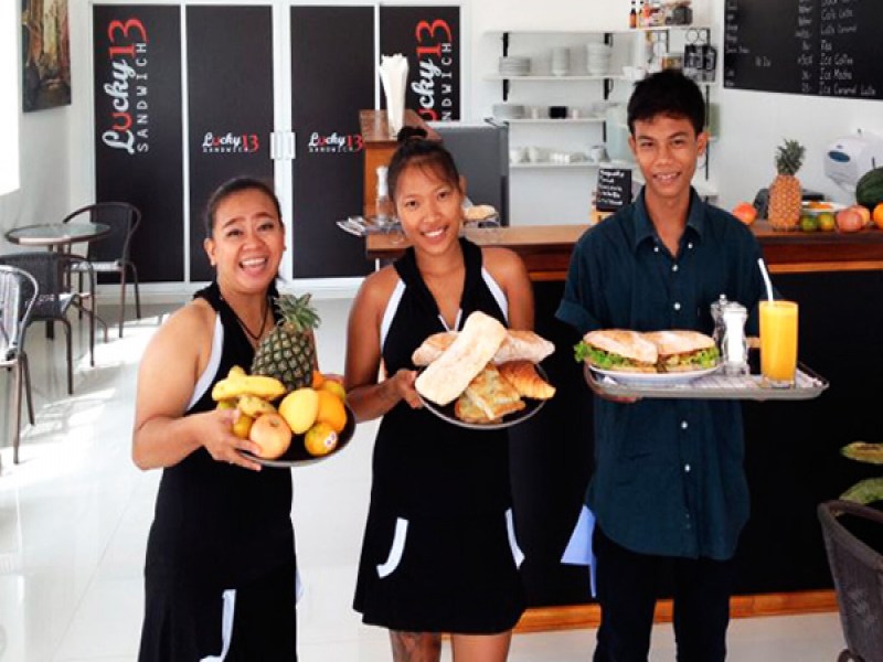 Lucky 13 Sandwich Bar & Coffee Shop, located near the Shell Museum on Viset Road, offers a variety of hot and cold beverages, sandwiches made with a selection of breads, breakfast items, healthy salads, and free WiFi. Open 24/7, they also serve detox smoothies and juices like apple and beetroot.