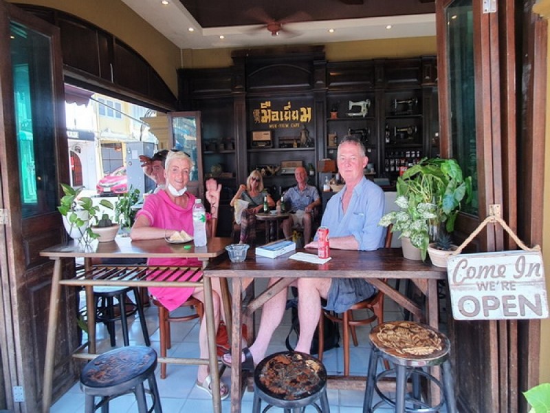 The Mue-Yium Cafe & Bistro serves delicious coffee made using toasted Thai coffee beans. They also offer a variety of other drinks, including juices, bubble teas and sodas, plus food such as Thai dishes, sandwiches, breakfast items and cakes and desserts. The interior is in a traditional, Old Phuket style and features patterned floor tiling, wooden furnishings and folding doors and blinds that fully open onto the street, allowing for great views of town life and old buildings. The Mue-Yium or Mueyium Cafe & Bistro is situated in Old Phuket Town on Thalang Rd. It is positioned at the traffic light, crossroad junction with Krabi Rd, Yaowarad Rd and Thalang Rd.