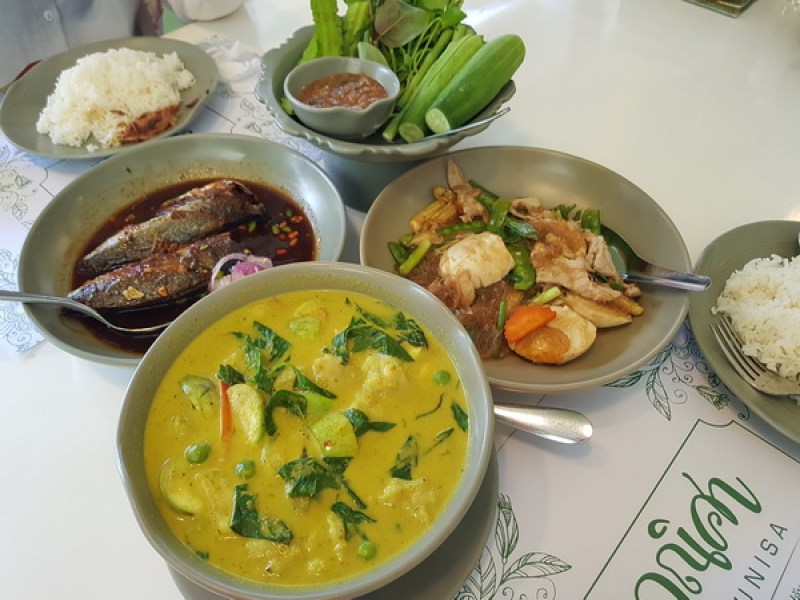 Phunisa Restaurant Phuket serves Thai food. The main focus is on seafood, including Grilled River Shrimps, Crab and Fish Dishes, Spicy Salads and various Soups. The interior is modern, with dark, warm-colored painted walls and light wood dining tables and chairs. Phunisa Restaurant is situated in Phuket Town, near to the Phuket Provincial Electricity Office.