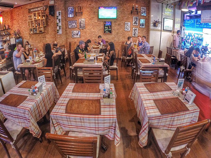 Pizzeria Hut 1 Restaurant offers two dining areas, one air-conditioned and classic, the other open-air, serving a variety of pizzas and homemade dishes, with a wood-fired brick oven for traditional Italian taste. They also provide CCTV footage of chefs preparing food, free delivery, and are conveniently located in Patong near Bangla Road.