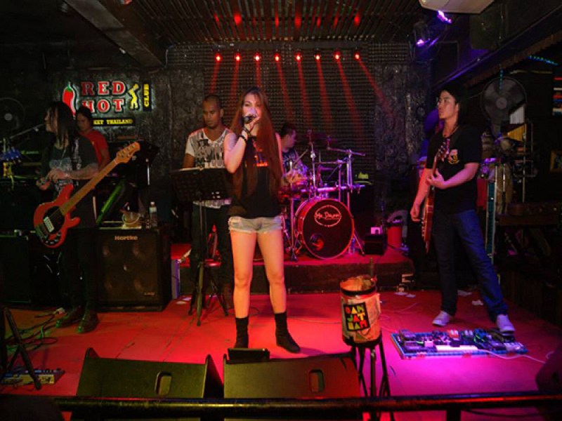 The Red Hot Club, Patong is easy to find being sited at the end of Bangla Road. It is the idea place for those not wanting hassle from girls and enjoy live music. A live, talented band plays a wide selection of different types of music every night, including covers of classic Rock, Reggae and Pop songs that will get your feet tapping. The Red Hot Club has high tables and stools. Drinks are served at the tables by waitresses.