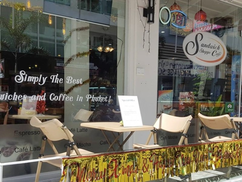 Sandwich Shoppe Cafe & Bar Patong provides a very good selection of tempting cakes and pastries such as focaccia, croissants and muffins and a good choice of fresh breads including bagels, ciabatta, focaccia whole wheat and white breads and rolls. There all day breakfast options include eggs, bacon and toast, omelettes. French toast, pancakes with maple sryup, egg and ham muffins and more. Daytime and evening dishes include pick your own ingredient salads and Thai food tempura, spring rolls, chicken coconut soup, bean curd soup, green curry, malay chicken curry and vegetarian dishes. Drinks offered include ground coffee frappes, tea, iced chocolate, beers, wines and spirts. Sandwich Shoppe Cafe & Bar Patong provides free Wifi, outdoor and indoor seating, and a large TV that is used to show sporting events. Sandwich Shoppe Cafe & Bar Patong is situated just off Rat-U-Thit 200 Pee Road, in Aroomsom Plaza, almost opposite to the Patong Language School, and a few minutes walk from the Andaman Beach Suites and BYD Lofts Boutique Hotel & Services Apartments.