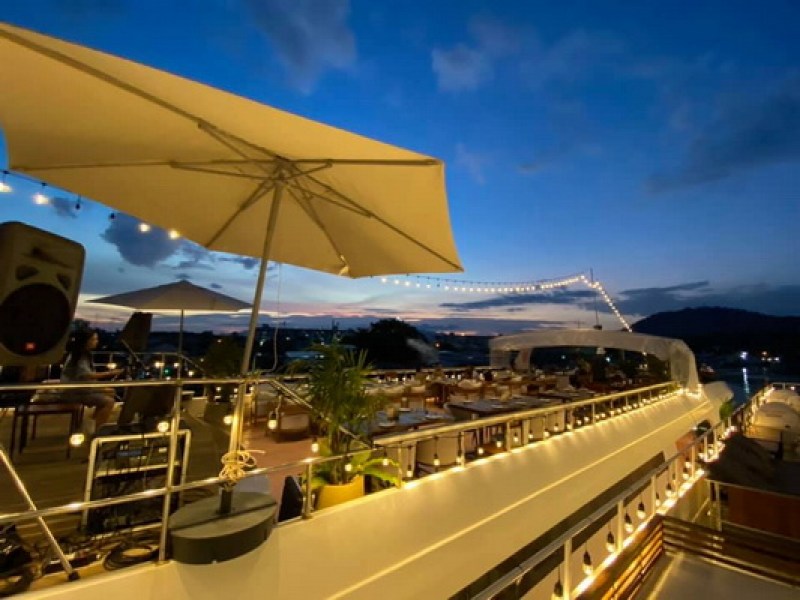 The Sea Angel Boat Club offers a diverse menu of fresh seafood, Thai food, pizzas, burgers, cakes, desserts, coffee, cold beers, and cocktails on a unique boat setting in Ratsada, Phuket. Customers can enjoy their meal or drinks on the upper outdoor deck or lower indoor deck while taking in the scenic views.