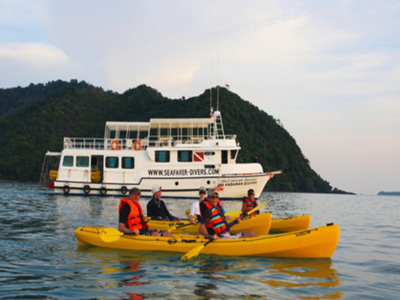 Thailand Phuket Phang Nga Krabi CMAS PADI scuba diving center canoe kayak paddling centre Thailand Phuket Pang-Nga Krabi TDA CMAS PADI NAUI 5 star itc scuba dive academy center - canoe kayak paddling EPP FFCK centre - tour excursion circuit safari in jungle mangroves Andaman Sea islands. SEAFARER DIVERS - PHUKET is located at Chalong Bay Marina in Phuket Thailand and is proud to be standing by an Expat-Thai family-owned Phuket diving business. Since 1979, we have guided thousands of scuba divers to world-class dive sites in Phuket, Thailand. From Phuket in Thailand, let's go diving to Andaman Sea diving liveaboard, Koh Similan Islands diving liveaboard, Koh Bon Island diving liveaboard, Koh Surin Iislands diving liveaboard, Richelieu Rock diving liveaboard, Phi-Phi Islands diving liveaboard, Racha Yai and Noi Islands diving liveaboard, Koh Doc Mai Island diving liveaboard, Shark Point day diving liveaboard, King Cruiser wreck diving liveaboard, Hin Daeng & Hin Muang diving liveaboard, Tarutao islands diving liveaboard. PADI, TDA / CMAS and NAUI diving Divemasters and Instructors in Phuket are standing by with top of the line equipment and diving liveaboard boat from phuket to get divers where they want to be for diving arounf Phuket to day dive trips or Phuket liveaboard dive boats. In Phuket, we cater for both experienced and non experienced single divers to groups and dive clubs. Our professional PADI, TDA/CMAS and NAUI dive center in Phuket provides diving services such as rentals, sales and servicing for most brands of diving regulators, diving BCD and diving tank valves as well an air and Nitrox refill station for the most demanding divers in phuket, Thailand. From Phuket, Thailand, our diving liveaboard MV ANDAMAN SEAFARER is a comfortable wood and steel liveaboard diving vessel. From Phuket, regular diving liveaboard dive cruises of 4, 5 or 6 diving days are scheduled on Sundays from November to April: Koh Similan Islands diving liveaboard, Koh Bon Island diving liveaboard, Koh Tachai Island diving liveaboard, Koh Surin Islands diving liveaboard, Richelieu Rock diving liveaboard, Koh Phi-Phi Islands diving liveaboard, Koh Racha Yai and Noi Islands diving liveaboard, Koh Doc Mai diving liveaboard, Shark Point diving liveaboard, King Cruiser wreck diving liveaboard, Hin Daeng diving liveaboard, Hin Muang diving liveaboard, Koh Ha Yai islands diving liveaboard, Koh Lipee Island diving liveaboard, Koh Butang Island diving liveaboard, Koh Rawi Island diving liveaboard and Koh Adang Island diving liveaboard. MV Andaman Seafarer diving liveaboard. Our diving liveaboard vessel accommodates up to 14 passengers and divers: 6 in three VIP A/C private cabins (two single berths) and 8 in two FIRST CLASS A/C cabins (four single berths). Each cabin has 2 or 4 single berths with standard mattresses (200x90). The diving decks are wide and spacious to provide guests with a maximum diving convenience and tropical living during our Koh Similan Islands diving liveaboard. PADI - TDA/CMAS - NAUI DIVE TRAINING COURSES or DIVEMASTER & INSTRUCTOR INTERNSHIP DIVING COURSES are taught by certified PADI, TDA/CMAS & NAUI diving Instructors fluent in English, French, German and Thai languages with classroom and convenient nearby diving sites like Koh Racha Yai and Noi Islands dive sites, Shark point dive site, King Cruiser wreck dive site, Koh Doc Mai Island dive sites and Koh Phi-Phi Islands dive sites. PADI, TDA/CMAS or NAUI crossovers dive training courses or internship training dive course packages from beginner diver course up to professional intructor diving training course levels are available all year round in Phuket, Thailand with our dive center located in Phuket. Diving training courses in Phuket - Thailand / PADI SCUBA DIVING TRAINING COURSES or INTERNSHIP COURSES: PADI Bubblemaker for Kid, PADI Discover Scuba diver course, PADI Scuba for Certified diver course, PADI Scuba diver course, PADI Open Water Diver course and PADI Refferral diver course, PADI Specialty Diver course (Deep, Wreck, Night, etc. . . ), PADI Adventure Diver course, PADI Advanced Open Water Diver course, PADI Emergency First Response course, PADI Rescue Diver course, PADI Divemaster "Short training diving course" or "Internship diving training course". Diving training courses in Phuket - Thailand / TDA / CMAS SCUBA DIVING TRAINING or DIVEMASTER & INSTRUCTOR INTERNSHIP DIVING TRAINING COURSES: TDA / CMAS One Star Diver, TDA / CMAS Two Star Diver, TDA / CMAS Three Star Diver "Short training" or "Internship", TDA / CMAS One Star Instructor, TDA / CMAS 1 Star Instructor/Crossover, TDA / CMAS Two Star Instructor, TDA/ CMAS 2 Star Instructor/Crossover, TDA / CMAS Three Star Instructor, CMAS / TDA 3 Star Instructor/Crossover. Diving training courses in Phuket - Thailand / NAUI DIVING TRAINING COURSES or INTERNSHIP DIVING TRAINING COURSES: NAUI Scuba Diver course, NAUI Specialty Diver course (Deep, Wreck, Night, etc. . . ), NAUI First Aid & CPR Training courses, NAUI Scuba Rescue Diver course, NAUI Advanced Scuba Diver course, NAUI Advanced Scuba Rescue Diver course, NAUI Master Scuba Diver course, NAUI Divemaster "Short diving training course" or "Internship diving training course", NAUI Instructor diving Training Course / ITC, NAUI Instructor Crossover diving training Course / ICC, NAUI First Aid Instructor diving training Course, NAUI Instructor Trainerdiving training course. Phuket diving liveaboard center - Phuket canoe kayak paddling center EPP & FFCK TDA CMAS 5 Star ITC Master Dive Academy - Internship dive training course school PADI & NAUI dive center.