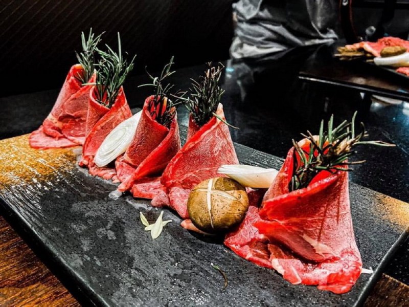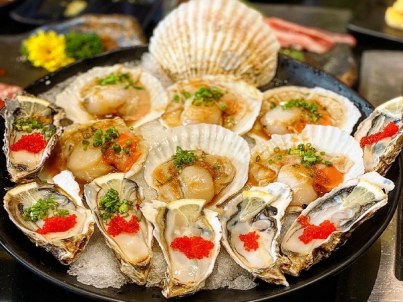 Shokun Yakiniku is a Japanese restaurant in Phuket Town offering premium meat and fish cuts, including wagyu beef and shellfish, for grill-it-yourself dining in a sleek black-themed interior.