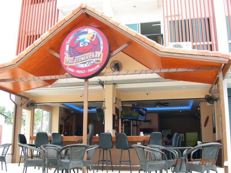 Stoned Crab Pub is a friendly Sports Bar in Rawai. It serves ice cold beers and has 5 TV's and a pool table that is free to use. It is open for breakfast, lunch and dinner and shows a host of sporting events Football, Rugby, Golf, Tennis, Formula 1 and International Events. The food menu lists classic, Thai dishes and comfort European food such as burgers, sandwiches and their popular with the local expat community American Chicken Wings. For kids there is a small kids section with a TV, Fireman's Pole and free Wifi for their electronic games. From Chalong traffic Circle drive towards Rawai, after about a 5 minute drive turn right at the traffic lights, sign posted Highway 4009, Nai Harn, after a few minutes drive you will see the Stoned Crab Pub on your left hand side.
