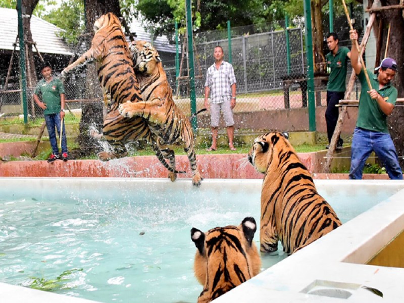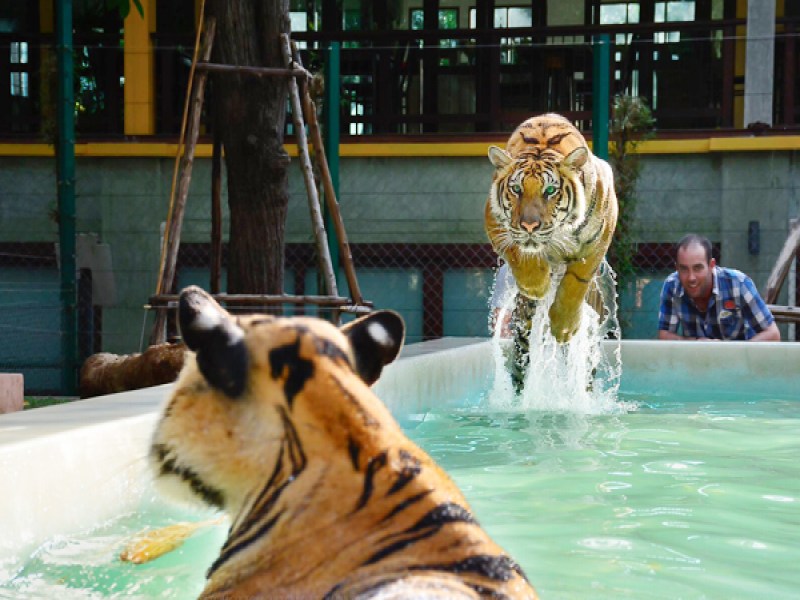 Tiger Kingdom is in the Kathu district of Phuket, and is the place to go if you want to get up real close to fully grown tigers or young tiger cubs. Tigers here have been hand raised by their trainers since young, therefore that have a strong bond with their trainers. Before entering visitors are asked to leave belongings such as bags and their shoes in the locker room, and wash their hands. Cameras can be taken inside but the flash cannot be used and must be turned off. There is a staff photographer that can also take photos it required. The well trained and experienced staff are able to answer any questions visitors may have and ensure you have a pleasant time. But always remember these Big Cats are still wild animals, treat them with respect and follow the safety rules and instructions of the staff. After a walk around the rooms and small gardens, visitors may want to stop off at the tiger view restaurant before heading back to the beach or their hotel. Tiger Kingdom is not difficult, to find being at the base of Patong Hill right next to the Patong Go Kart Speedway Track on Phra Barami Road, highway 4029.