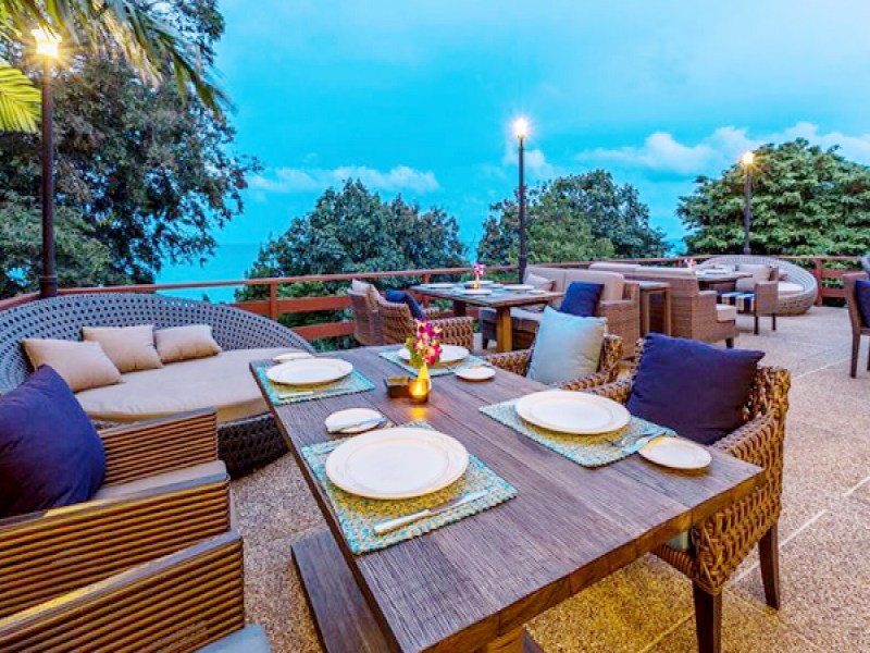 Top Of The Reef Restaurant at Cape Panwa Hotel offers elegant dining with panoramic views of Cape Panwa and the Andaman Sea. Guests can enjoy French, seafood, and steak dishes in a romantic atmosphere with live music, both indoors and on the outdoor terrace.