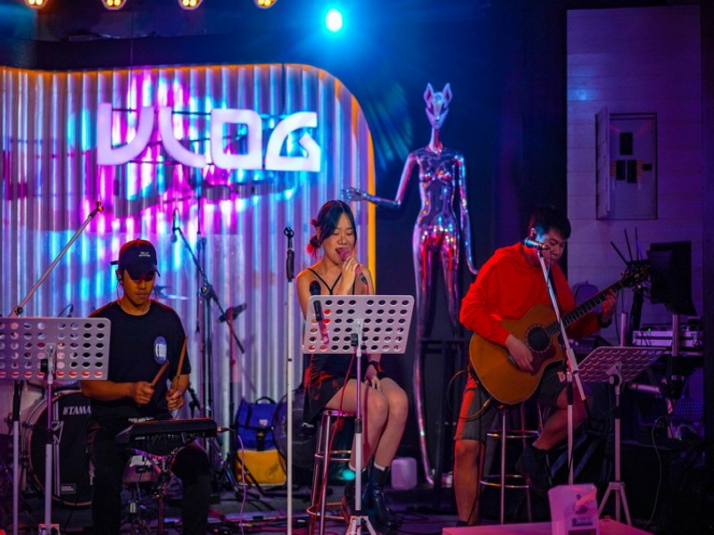 Vlog Bar Phuket is a trendy bar in Phuket town known for its live music performances and DJ sets, attracting a young local crowd. They also offer a limited food menu for patrons to enjoy.