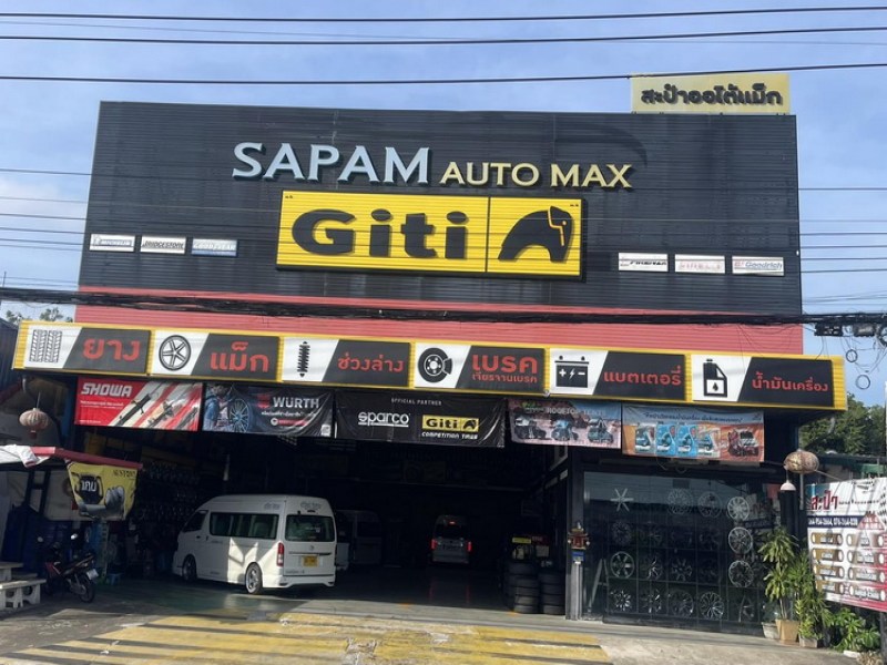 Sapam Auto Max is a modern auto shop near Mee Sapam, offering a selection of stylish wheels and new tires, as well as suspension repair, engine oil changes, and brake servicing. Customers can relax in the air-conditioned waiting area while their vehicle is being serviced.