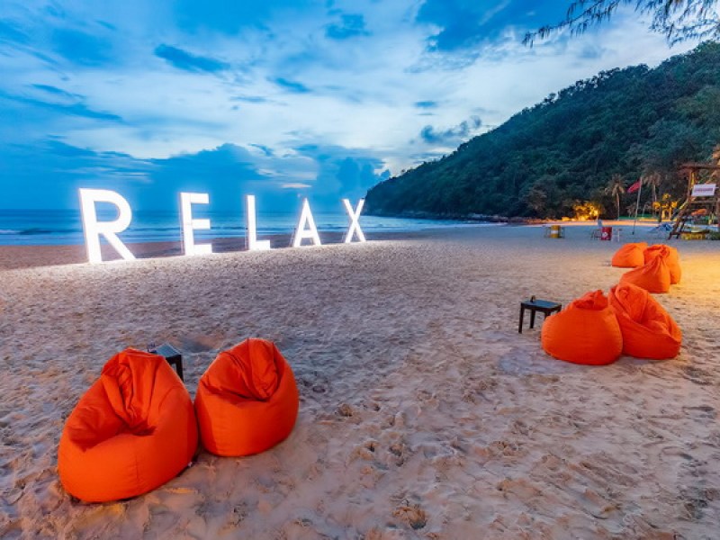 Relax Beach Bar at Le Meridien Phuket Beach Resort offers stunning sea views on Karon Noi beach, with a focus on sunset cocktails, ice-cold beer, BBQ food, and seafood.