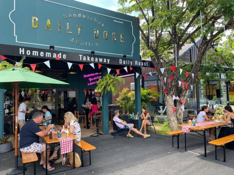 Daily Dose Cherngtalay in Phuket offers a variety of fresh bakery products, sandwiches, and beverages in a stylish setting with an open kitchen and outdoor terrace, located near Villa Mart car park in Boat Avenue Cherngtalay.