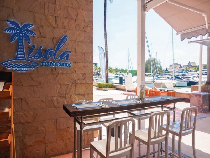 Isola Restaurant at Royal Phuket Marina offers authentic Italian cuisine made with fresh, locally sourced ingredients by a genuine Italian chef. Enjoy signature dishes like homemade pasta and thin pizzas while dining indoors or alfresco with views of luxury yachts.