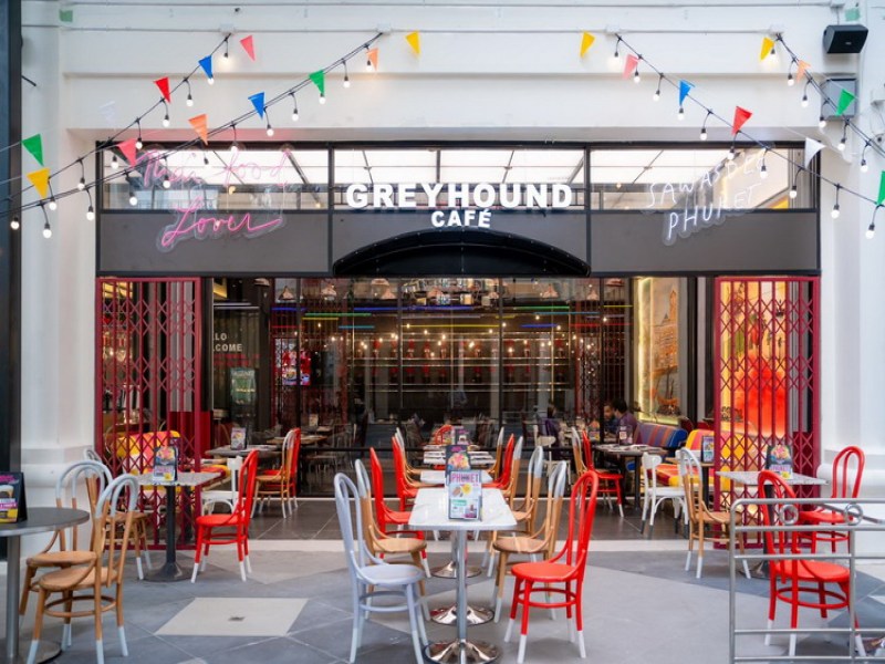 Greyhound Cafe in Jungceylon Mall Patong offers a unique dining experience with Thai-inspired decor and a menu of innovative twists on traditional Thai dishes, including Crab Fried Rice, Stir-fried Spaghetti with Gourami Fish, and Young Coconut Crepe Cake.