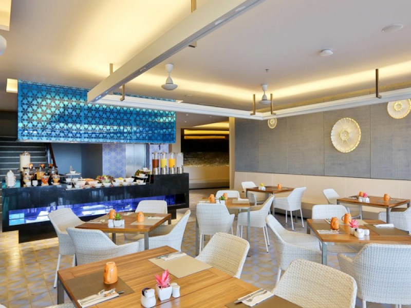 The Seacret Restaurant at Katathani Phuket Beach Resort offers a mix of local and international dishes, including Mee Hoon Kaeng Poo and seafood, with live jazz music in a modern setting surrounded by lush gardens near the beach.