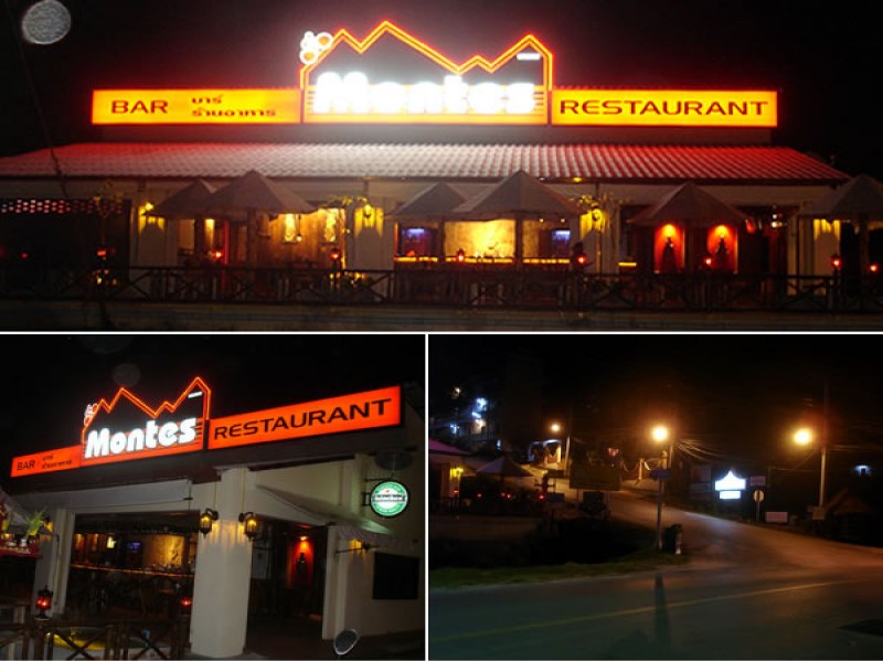 Montes Restaurant & Bar, located just outside Patong beach, offers a mix of classic Thai, International, Belgian, and French dishes in a unique indoor and outdoor dining setting. Special buffet style Thai & French dinners are available on select nights, with popular menu items including roasted chicken, pork loin, lamb, and chicken red curry.