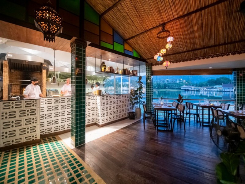 Bodega & Grill Restaurant offers a luxurious dining experience with a cocktail bar, wine cellar, and premium cuisines such as Australian Wagyu beef and Mediterranean dishes. Located at Angsana Laguna Resort Phuket, the restaurant features an elegant interior and outdoor dining space by a beautiful lagoon.