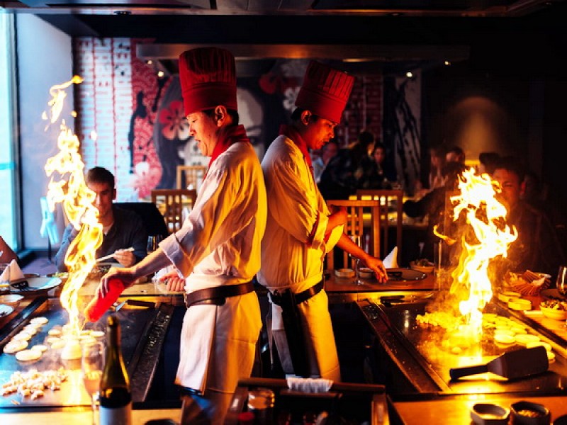 Benihana Restaurant offers premium Australian Black Angus and Japanese/Australian beef steaks, traditional teppanyaki, sushi rolls, and desserts in an upscale setting with communal Hibachi tables for entertaining cooking. Located at JW Marriott Phuket Resort & Spa in Mai Khao, Phuket.