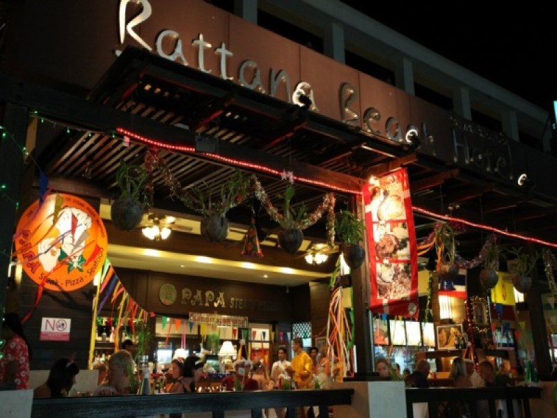 The Papa Steak & Pizza Restaurant at Rattana Beach Hotel offers a diverse menu of affordable steaks, Italian pizzas, and Thai dishes, with indoor and outdoor seating options and a weekly Elvis Presley tribute show for entertainment.