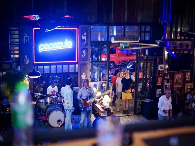Papazula is a trendy restaurant and bar in Old Phuket Town offering a mix of Turkish, Thai, and European cuisine, with live music performances most nights. Guests can enjoy indoor and outdoor seating options in a chic and vibrant atmosphere.