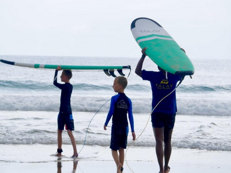 Talay Surf School in Phuket offers surf training and SUP lessons for all skill levels, partnering with resorts and organizations to provide a unique surfing experience. They also support local communities and allocate part of their revenue to improve lives and education.